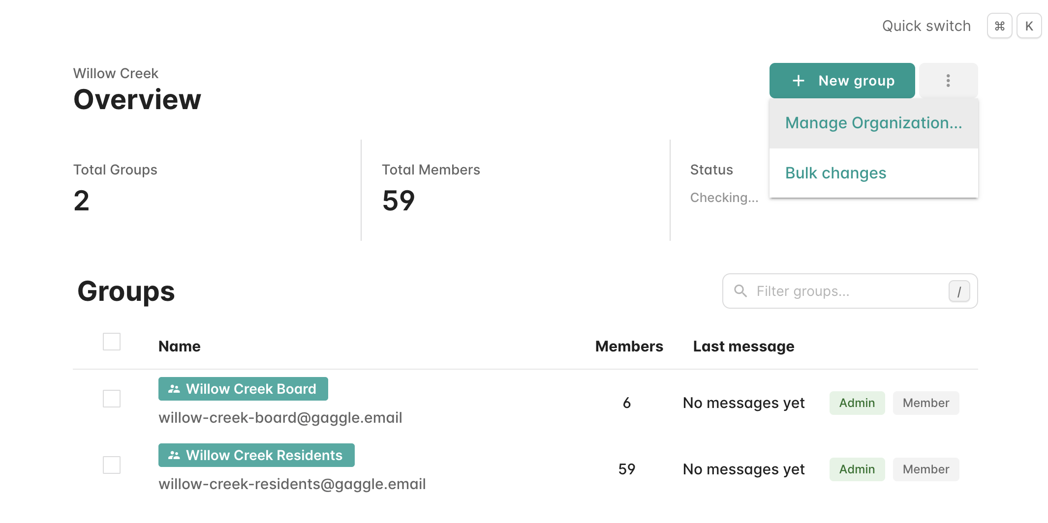 - To view a home page, select your Organization from the left sidebar. You will see the Overview page showing your groups, total members, and status.